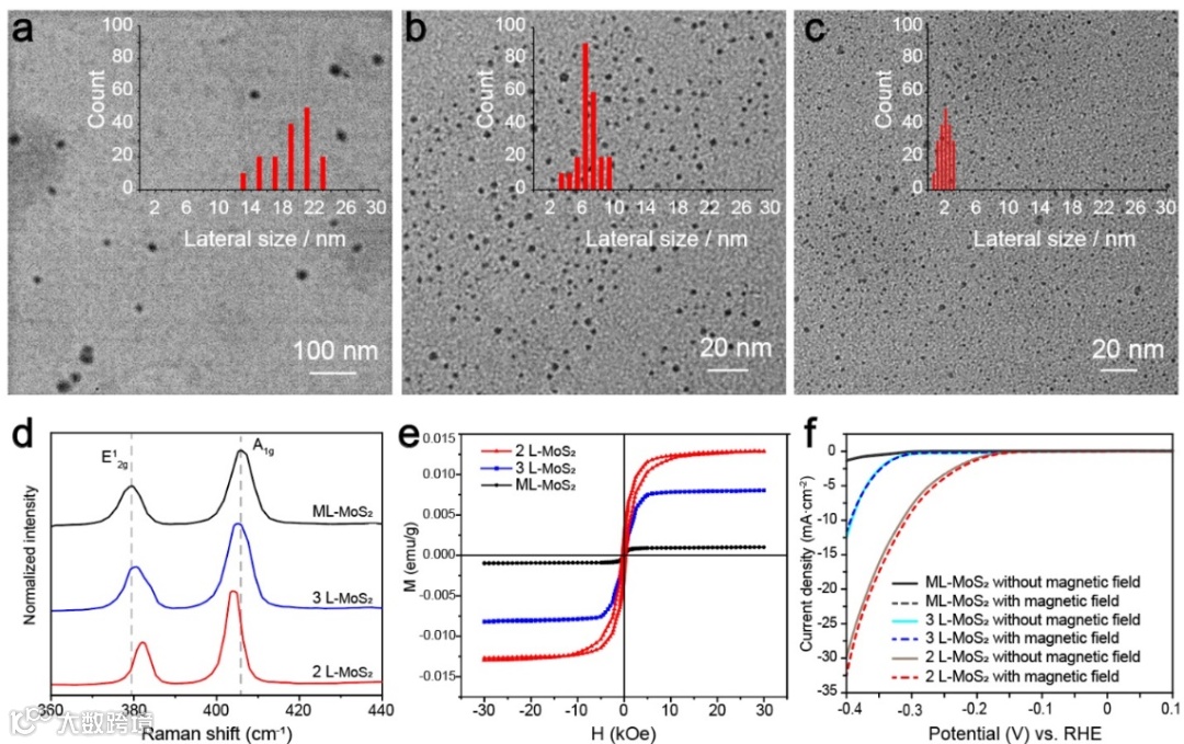 图2.(a)多层,(b)三层和(c)双层MoS2的TEM图像;MoS2的拉曼光谱(d)和磁滞曲线(e);(f) 三种MoS2在有无外部磁场条件下的极化曲线。