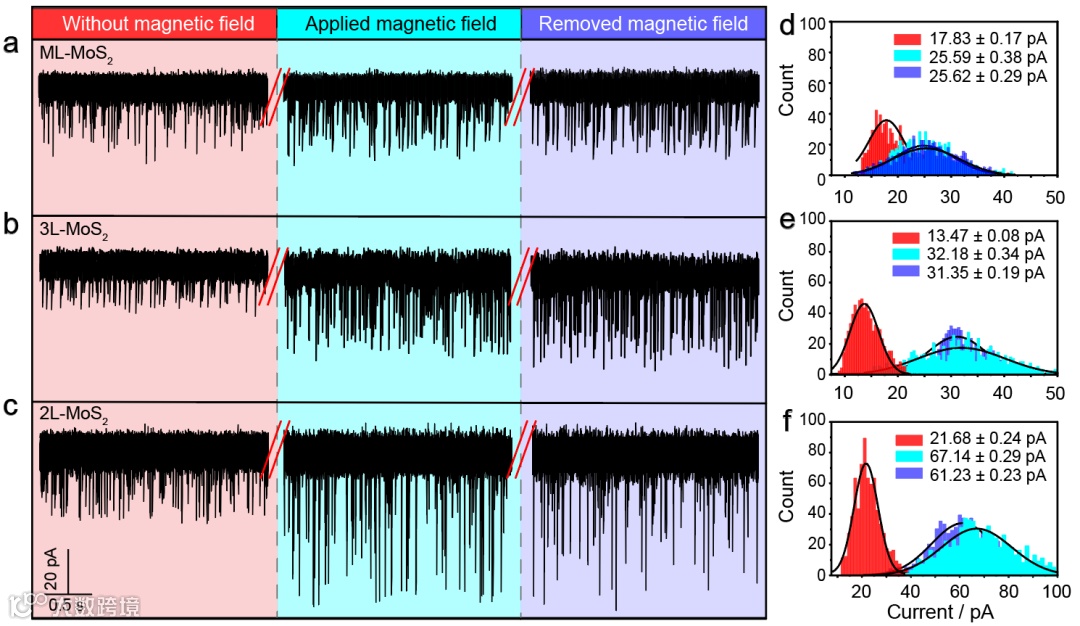图3. 单个多层(a),三层(b)和(c)双层MoS2在开启和关闭磁场下的电流-时间曲线;(d-f)薄层MoS2相应电流幅值的分布直方图。
