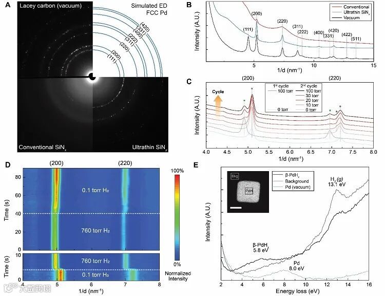 图3A、3B为在不同支撑载体下纳米Pd颗粒的电子衍射对比图,可以看出超薄芯片显著压制了膜材料本身的有害电子散射,提高的电子衍射的信噪比。而这也允许研究人员在原位气相实验中进行定量衍射分析。图3C-D的原位电子衍射,显示出Pd纳米颗粒在原位充氢、放氢过程中的相变行为。图3E的电子能量损失谱分析确认了相变产物Pd