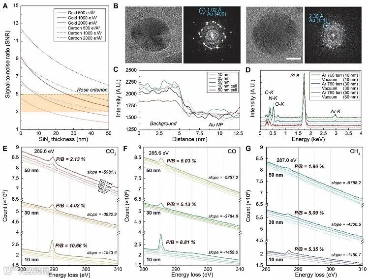 膜厚度下的高分辨像对比。可以看出与常规50 nm厚的原位芯片相比,超薄芯片的应用不仅提高了图像的信噪比,分辨率也从2.3 Å提高到1.0 Å。图2C显示出了能谱对比结果,可以看出在一个大气压的Ar环境下,当原位芯片窗口区域膜厚度从50 nm 降低到10 nm时,Ar/Si峰值比从0.59%升到8.3%,提高了14倍以上。图2E-G数据显示了超薄原位芯片显著提高了电子能量损失谱分析的灵敏度。