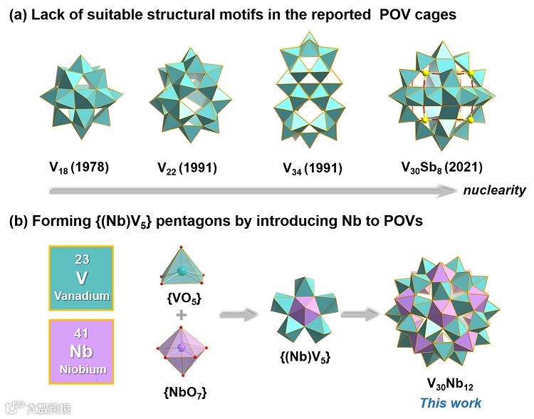 导读:北京理工大学胡长文教授、迟瑛楠教授与华南师范大学兰亚乾教授合作,首次在POV簇的合成中引入铌源,调控Nb、V的水解与聚合速率,利用铌源水解产生的{NbO7}诱导生成异金属{Nb(V5)}五角星构筑基元