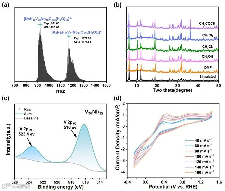 可以溶于水中,ESI-MS测试不仅证明该结构在水中保持稳定,而且发现在笼簇内部存在两个V原子。IR和PXRD证明,