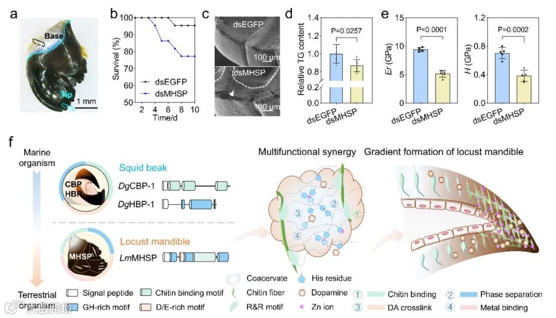 MHSP基因沉默导致飞蝗存活率下降 (b)、上颚磨损加剧(c)、甘油三酯相对含量降低 (e)、上颚尖端机械性能下降 (e);(f) 陆生生物