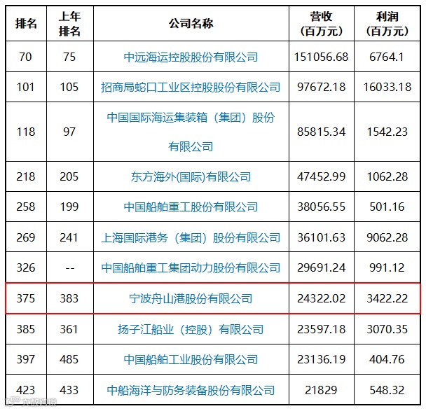 7月27日,2020《财富》中国500强排行榜正式发布,11家中国上市港航船舶企业入围500强榜单。宁波舟山港股份有限公司以243.2202亿元的营业收入列“500强”第375位,较上一年度提升了8位,在上市港航船舶企业中排名第8。