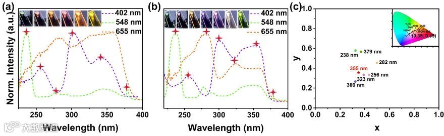 掺杂后化合物显示出明显的颜色可切换的Ex-De发射。通过进一步的光谱研究发现,传统的通过宿主晶格敏化的能量转移过程在此类材料并不存在,相反的,