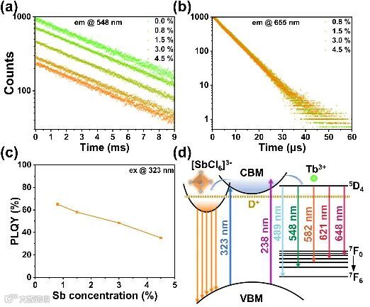 图3. (a)238 nm激发下监测的548 nm处的寿命。(b)323 nm激发下监测655 nm处的寿命。(c)323 nm激发下PLQY的变化。(d)S