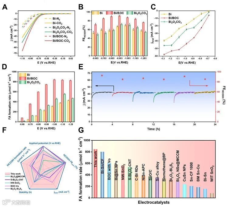 高2.7倍和1.8倍,并且性能优于大多数电催化剂(图3)。此外,Bi/BOC TNS电催化剂的阴极效率(CEE)提高到57.9%,远高于对照样品Bi (41.2%) 和