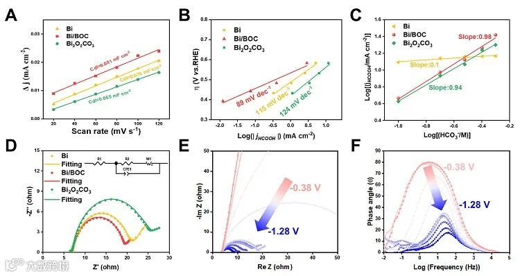 RR 催化性能的潜在因素,作者进行了电化学系列研究。首先,他们测量了双层电容(Cdl),Bi/BOC TNS表现最大值为 0.081 mF c