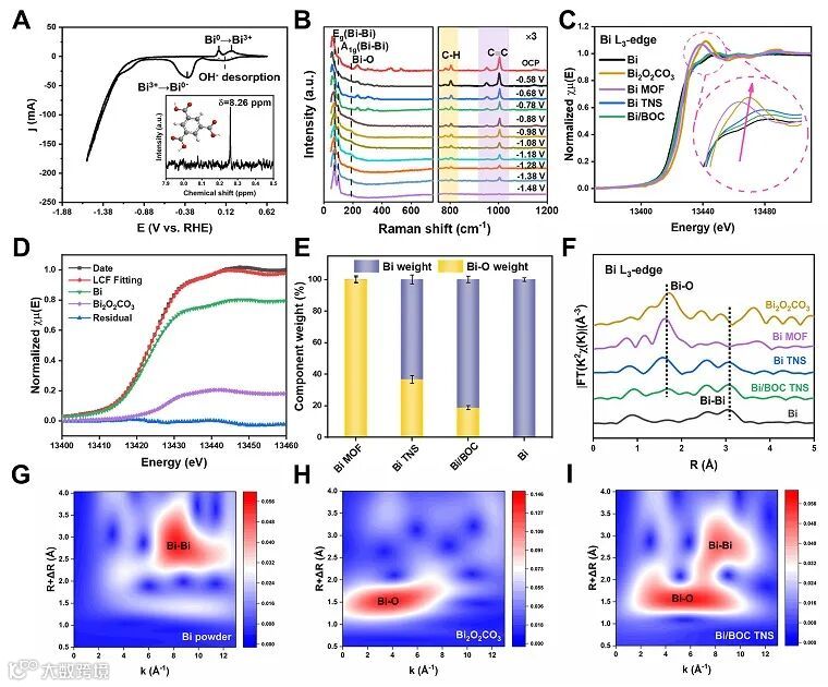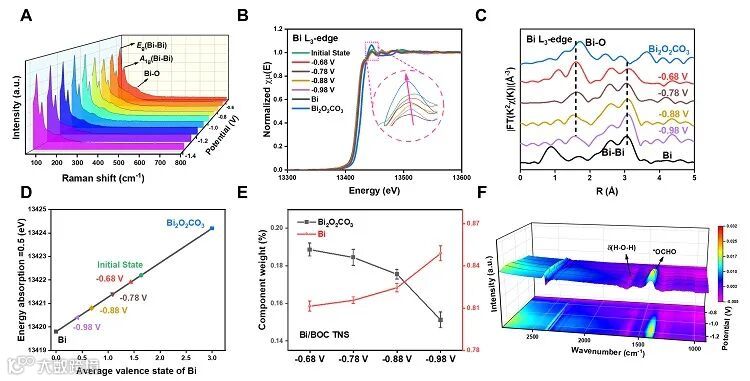 平均价态之间的半定量关系:+1.43 (−0.68 V) > +1.09 (−0.78 V) > +0.68 (−0.88 V) > +0.41 (−0.98 V),这与EXAFS拟合配位数和LCF拟合结果的趋势保持一致。上述结果表明,Bi/BOC TNS在实际反应过程中经历了结构重构,其中金属态Bi(