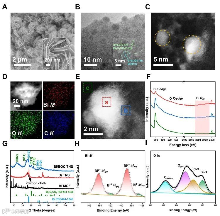 (BOC)的特征衍射峰,并且由SEM确认其基本形貌为薄层片状结构。HR-TEM图像表明,球形Bi纳米颗粒(~4.6 nm)均匀地分散在碳酸氧铋纳米片基底中。此外,对Bi/BOC TNS样品进行AC HAADF-STEM和EDS mapping观察到明亮的纳米颗粒均匀分散在载体BOC纳米片中,并且Bi、C和O元素均匀分布。随后选择高结晶度中心区域、界面区域和非样品区域进行EELS点扫描证实BOC载体上的Bi颗粒由