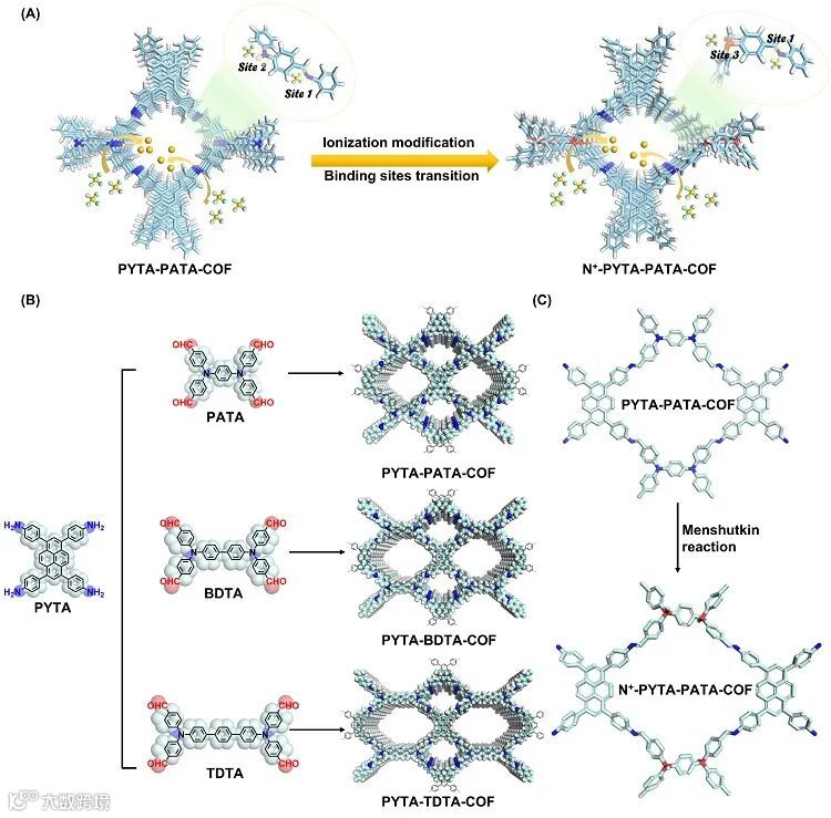 。此外,利用离子化后修饰策略,将骨架离子化,使金离子与COFs骨架通过库仑力结合,从而提高动力学性能,实现高效吸附。