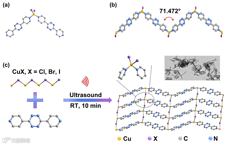 的配位模式。(b) CuX-dptz沿a轴的视图。(c) CuX-dptz的合成过程和二维结构示意图。插图:以CuBr-dptz片状结构为例的TEM图像。