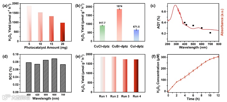 产率。条件:λ > 400nm,水(80 mL),催化剂(5 mg)。(c) CuBr-dptz的AQY和(d) SCC效率。(e) CuBr-dptz 的循环实验结果。(f) CuBr-dptz 长期实验的平均结果。条件:λ > 400 nm,水(160 mL),催化剂(20 mg)。误差条代表三次独立测量的标准偏差。