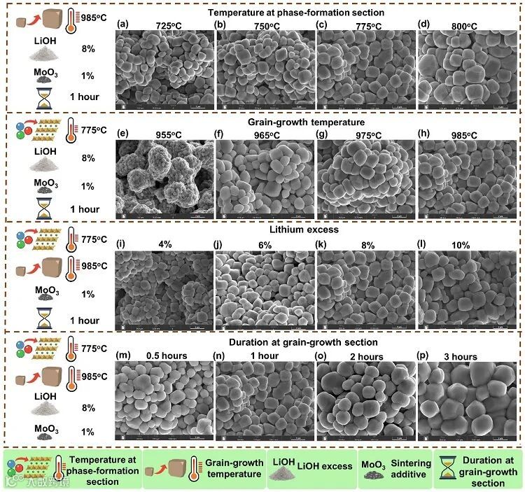 图2. 不同烧结条件对单晶NCM90形貌的调控:成相段温度,晶粒生长段温度,锂过量,晶粒生长段持续时间。