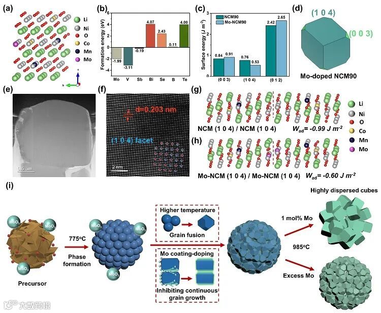 图1.(a,b)不同元素掺杂进NCM90结构的形成能。(c,d)Mo掺杂对NCM90晶体表面能和晶体形貌的影响。(e,f)Mo掺杂NCM90单晶表面结构TEM表征。(g,h)表面Mo掺杂对NCM90表面黏附功的影响。(i)Mo