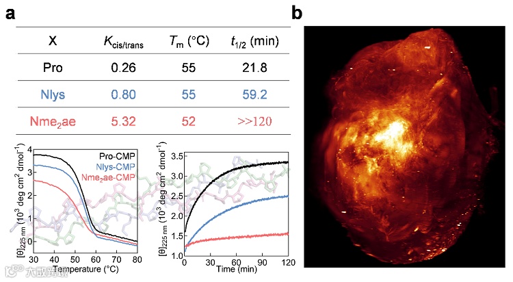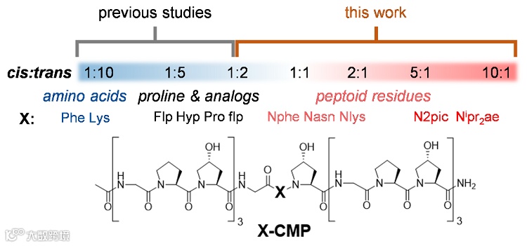 该研究团队利用不同顺反倾向性的类肽残基替代胶原蛋白模拟肽(CMP)序列中间的脯氨酸后,