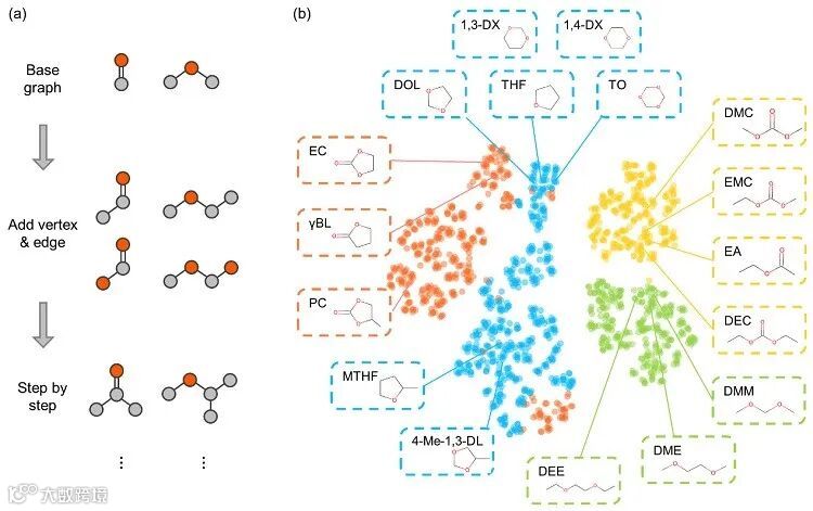 溶剂对锂电池电解液的稳定性起着至关重要的作用,新溶剂分子的发现往往会显著提升电池的性能。为了全面分析电解液溶剂,基于图论算法建立了一个大型溶剂分子数据库。该数据库包含1399个溶剂分子,其中44.9%为羰基化合物,55.1%为醚基化合物。为了实现数据库可视化,借助分子指纹和聚类算法将相似的分子映射到二维空间,全部溶剂分子被划分成了四个区域。目前电解液中广泛使用的溶剂分子,例如碳酸二甲酯(DMC)、碳酸乙烯酯(EC)、1,2-二甲氧基乙烷(DME)和1,3-二氧戊烷(DOL),都在该数据库中有所体现。