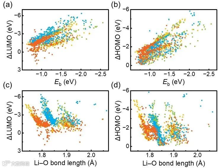 图2. LUMO和HOMO能级变化与结合能以及Li–O键键长变化之间的相关性