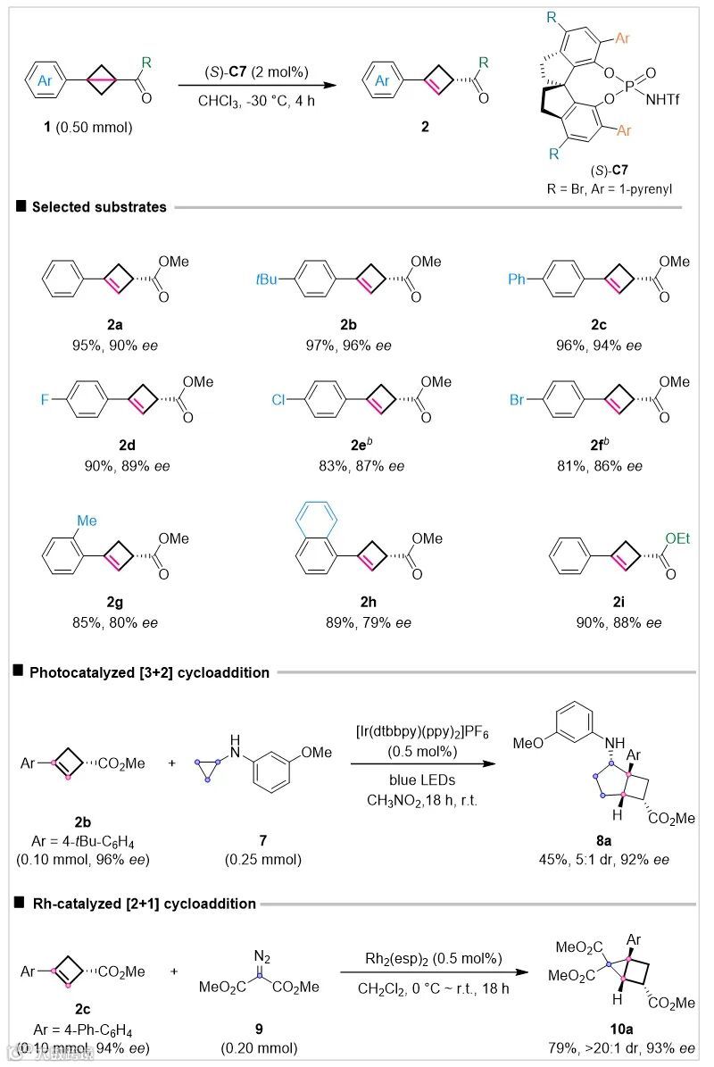 在上述设计思路的指导下,作者很快确定了反应的最优条件并在最优条件下对反应的底物范围进行了考察。实验结果表明,该反应条件温和,催化剂负载量低,底物范围广且具有良好的官能团兼容性。随后,以获得的手性环丁烯为平台分子进行了大量的转化反应。例如,将酯基转化为相应的醇、羧酸以及酰胺;通过双键发生环加成反应获得相应的手性二环[3.2.0]庚烷衍生物和二环[2.1.0]戊烷衍生物等。