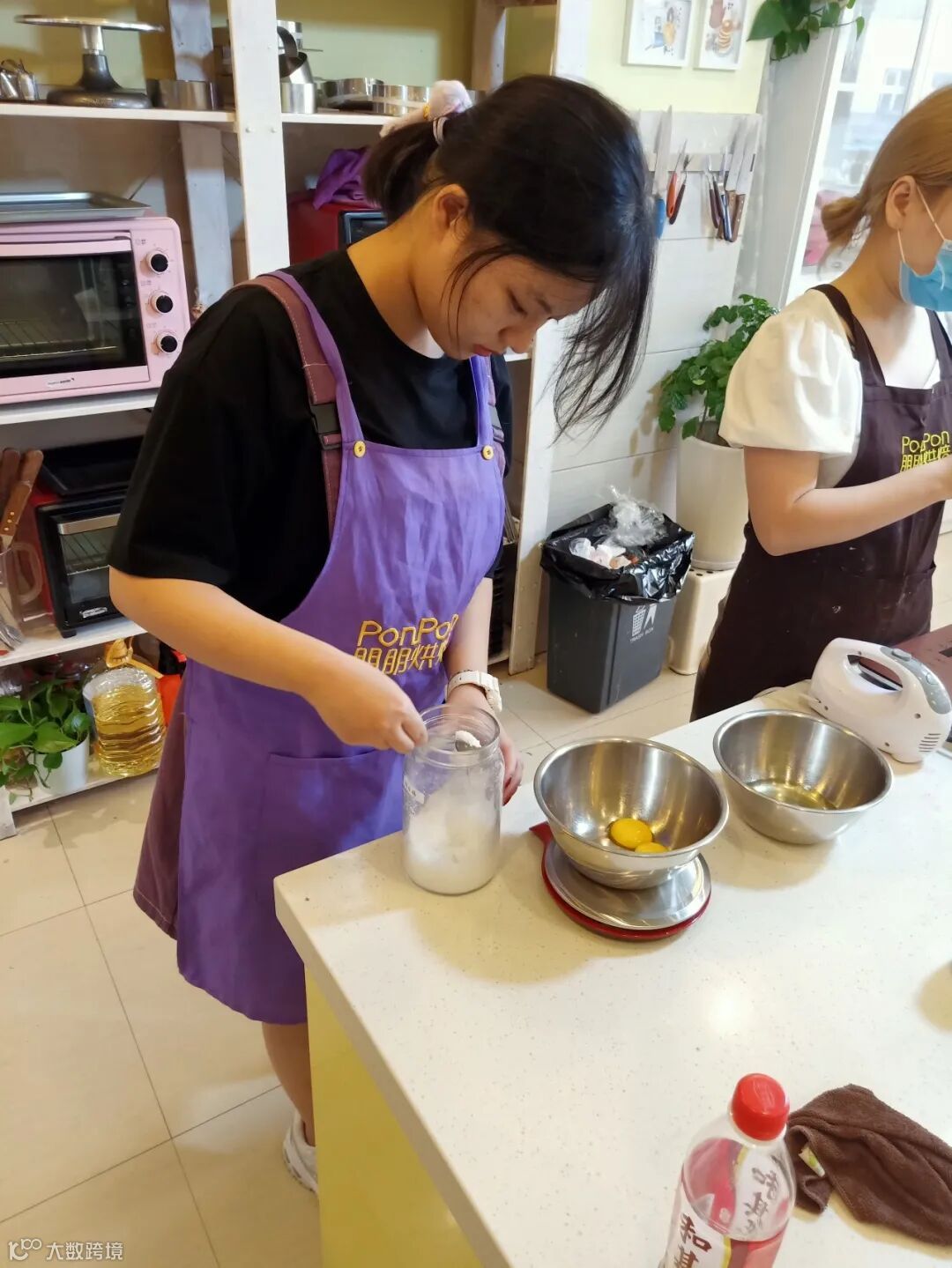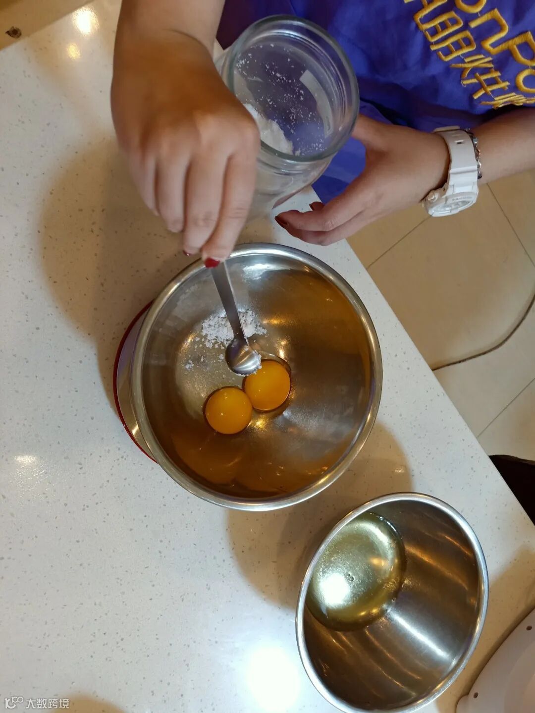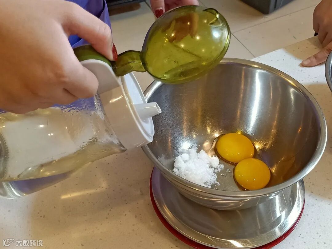 第二步:向装有蛋黄的容器内依次加入5克玉米油和5克盐。