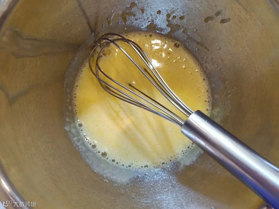 第四步:将容器内的蛋黄用搅拌器打散,搅拌至盆内液体呈现出流质状态。