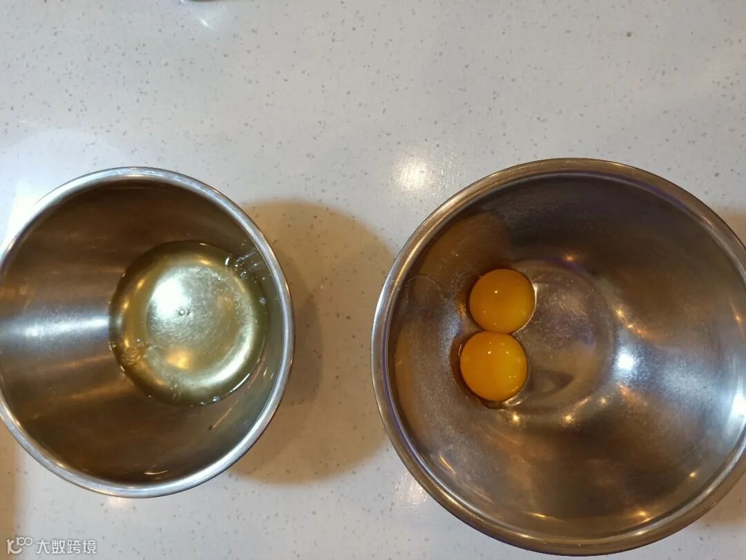 第一步:取两个鸡蛋,将蛋清蛋液分离后,分别装入两个容器里。