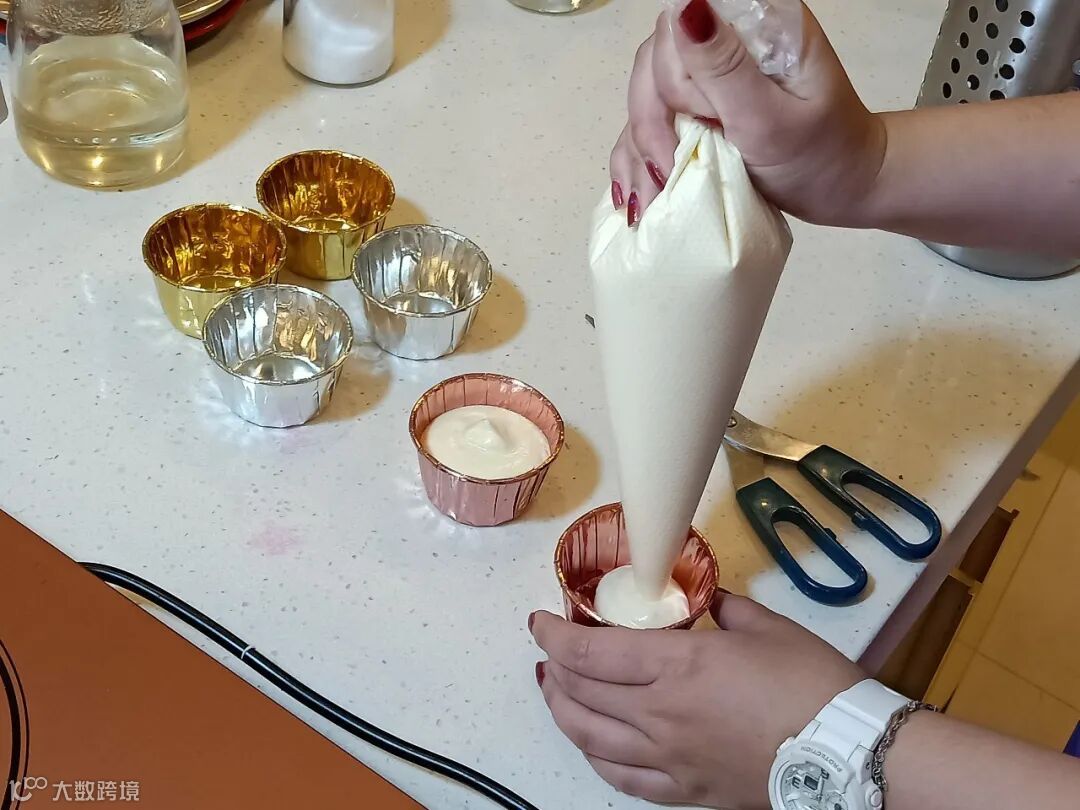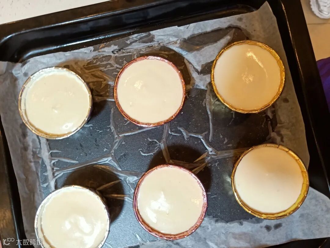 确保最后液体形成的平面比纸杯沿低上一些,不然的话烘烤过程中膨胀的面团可能会把杯子给撑破的。