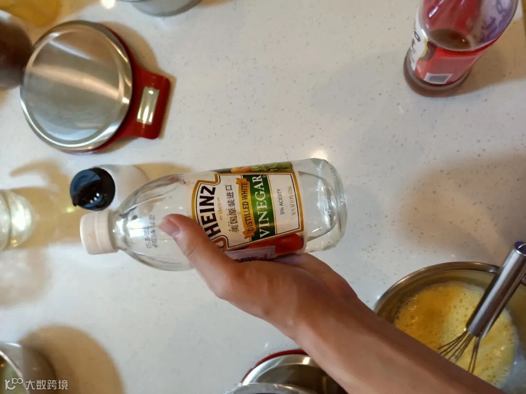 第五步:在蛋清中倒入一瓶盖苹果醋。