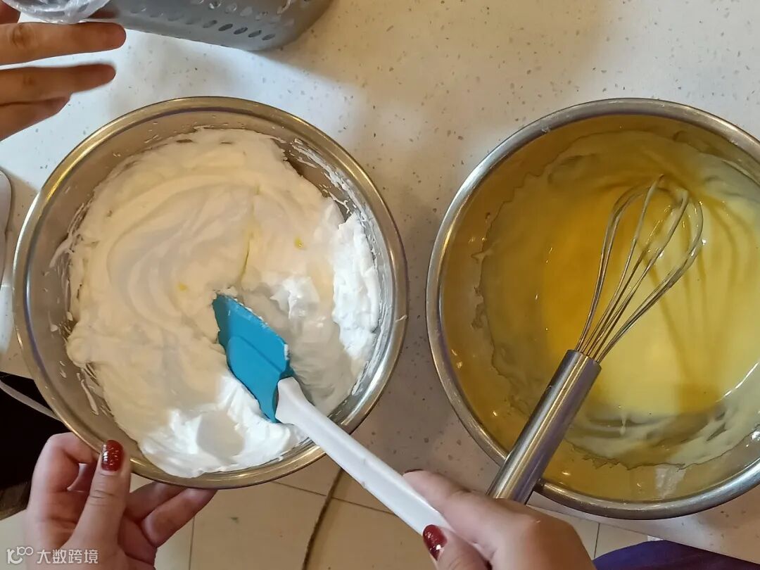 第八步:将蛋黄糊分两次加入打发好的蛋白糊里,搅拌均匀后倒入裱花袋里。