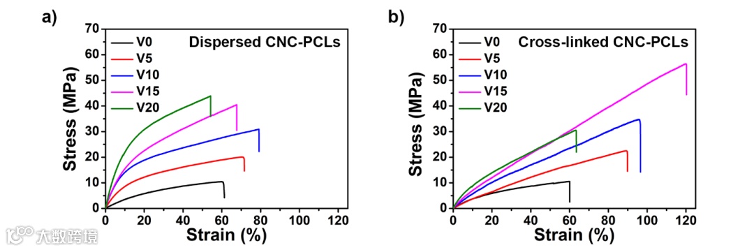 图3. 含有CNC-PCL的vitrimer纳米复合物的应变-应力曲线:(a)未处理前的分散掺杂状态;(b)热压酯交换反应后的交联状态(1 MPa,160 °C,24h)。