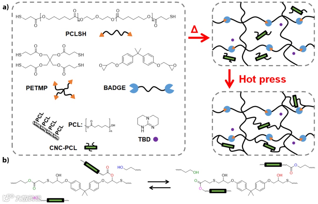 图2. (a)CNC-PCL交联于环氧-硫醇vitrimer网络的合成过程;(b)及其可逆酯交换反应。