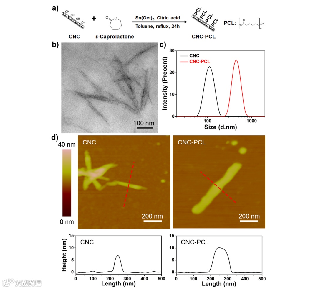 图1. (a)核壳结构CNC-PCL纳米杂化物的合成过程;(b)及其TEM图像;(c)CNC和CNC-PCL的动态光散射分析数据和(d)AFM图像及其表面数据图。
