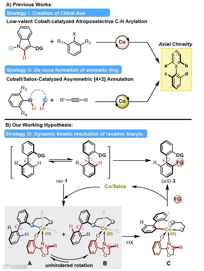 导读:近日,浙江大学史炳锋教授课题组报道了基于动态动力学拆分策略的钴/水杨基噁唑啉(Salox)催化阻转选择性C-H键芳基化反应,高效构建了一系列轴手性联芳化合物