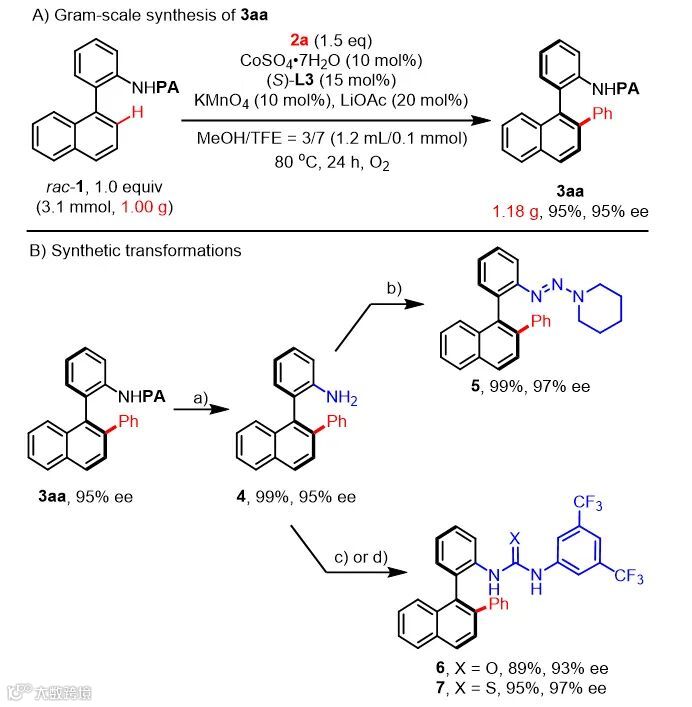 为验证该反应的应用价值,作者进行了克级规模制备与产物转化(图4)。在适当延长反应时间至24小时后,模版反应可顺利放大至3.1 mmol,克级规模制备产物