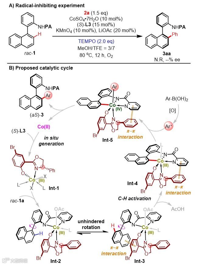 综上,史炳锋课题组通过简单钴盐/salox催化阻转选择性碳氢键芳基化反应,高效合成了一系列轴手性联芳化合物,并通过一系列转化证明了该方法的实用性。结合机理研究实验,作者提出了可能的反应机理。