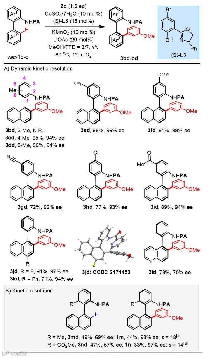基于动态动力学拆分策略的钴/水杨基噁唑啉(Salox)催化阻转选择性C-H键芳基化反应,高效构建了一系列轴手性联芳化合物