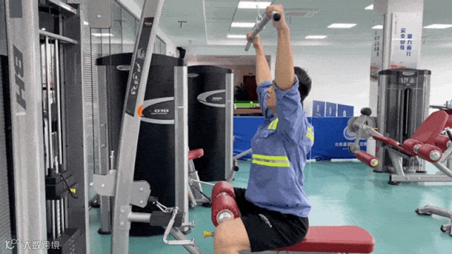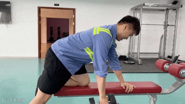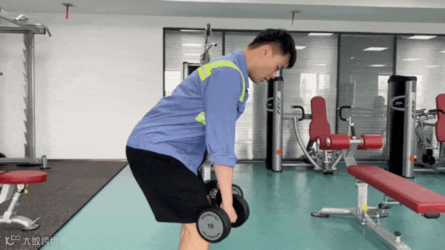 动作要领:背部挺直,核心收紧,单臂下放垂直于地面,将哑铃后屈至手肘和身体平行。