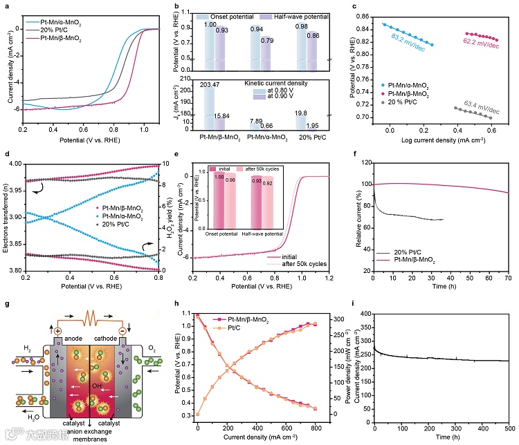 具体来讲,利用不同的二氧化锰基底调控Pt-Mn对的金属间距离和电荷分布,这是优化反应途径和调控ORR行为的关键。Pt-Mn/β-Mn