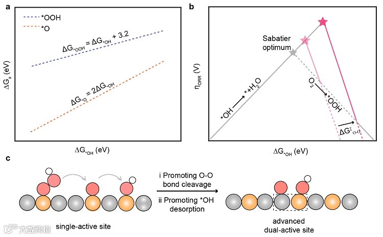 通过桥位吸附构型有效地促进了Pt-Mn位点上O-O的解离,与此同时*OH的脱附在单个Mn位点上动态改善,从而有效地避免了原有Sabatier的限制(图1)。