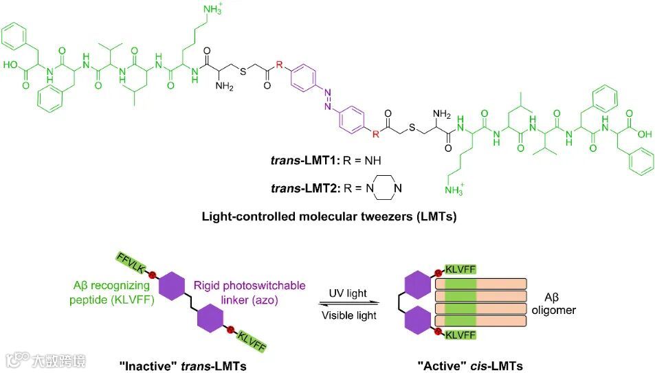 通过偶联Aβ亲和性的KLVFF短肽和光致异构活性的偶氮苯基团,作者构建了一类Aβ特定寡聚体分子捕获工具:光控分子钳(LMTs)(图1)。刚性的偶氮苯基团能够通过其光致顺反异构有效调控两臂KLVFF单元的空间距离。当光照诱导LMTs呈顺式钳形构型时,KLVFF单元距离较近,更易与尺寸匹配的Aβ寡聚体两侧端KLVFF区域稳定结合,实现对Aβ特定寡聚体的捕获。