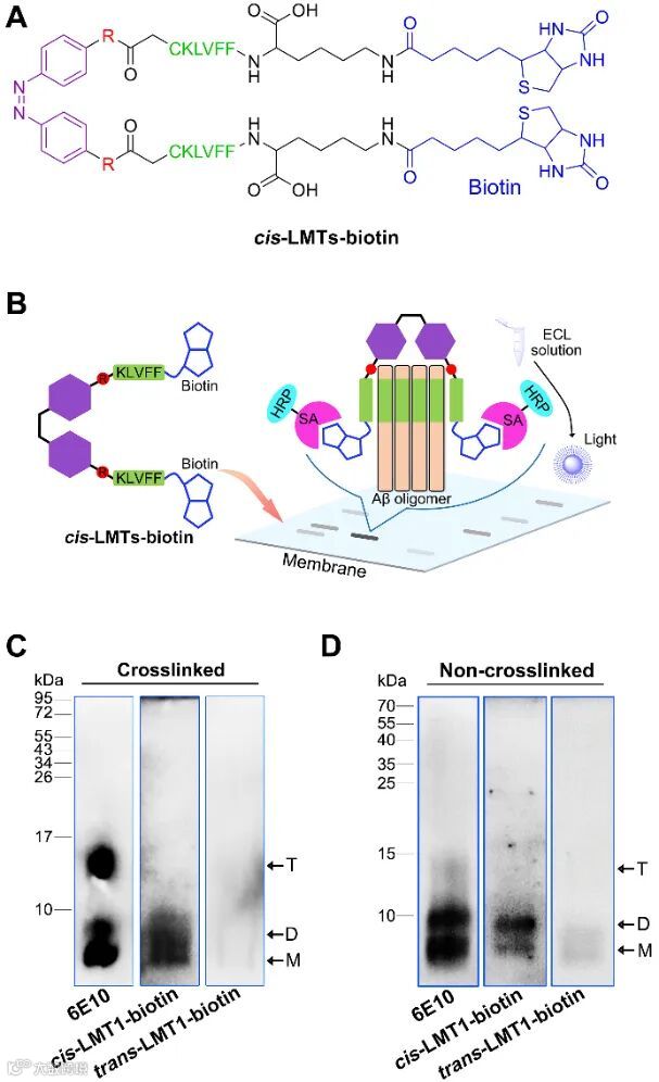 -LMT1-biotin能够选择性结合Aβ二聚体。相反,反式构型