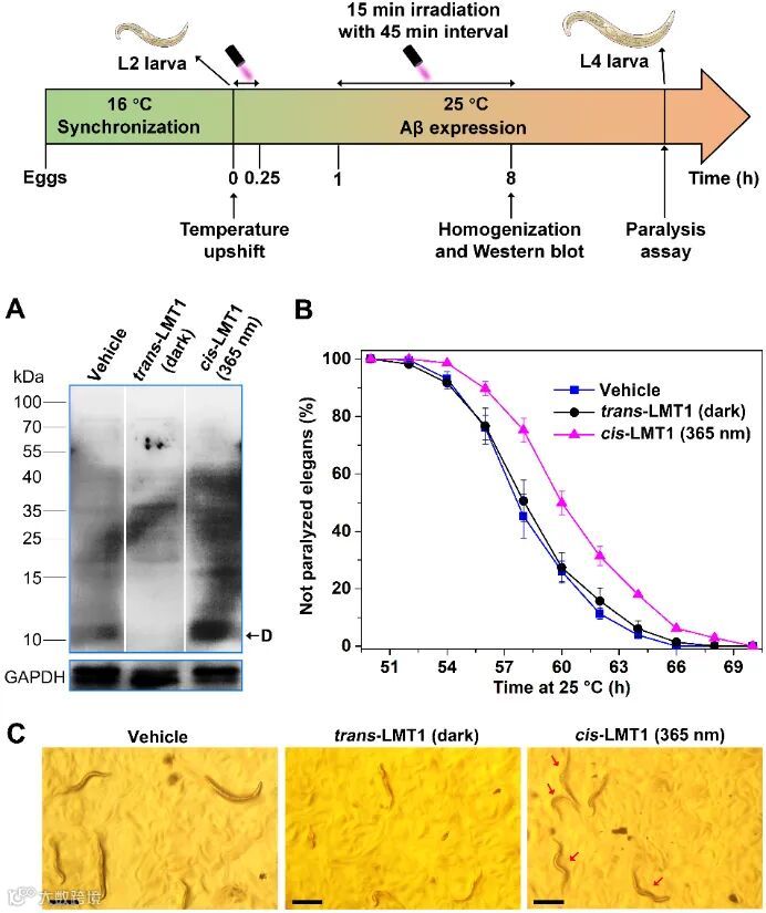 诱导的Aβ聚集体系中二聚体,且将其“冻结”,阻止其进一步聚集,降低Aβ聚集细胞毒性。而且基于顺反式构型的性能差异,LMT1能够利用光照实现对Aβ聚集过程的时空二维调控。最后,以表达Aβ42的转基因线虫为AD模式动物进行活体实验发现,