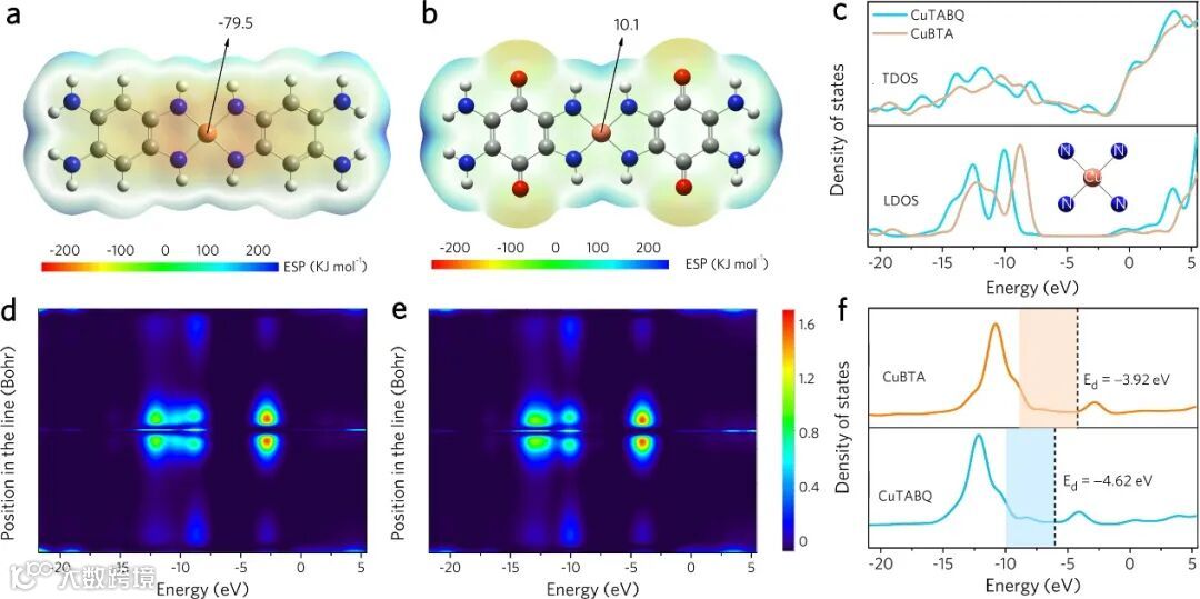理论计算表明,羰基的引入使Cu位点在CuTABQ中具有更正的静电势值(10.1 kJ/mol)更有利于吸附具有亲核性质的硝酸根阴离子。此外,在引入羰基后,实现了更好的结构稳定性。在碳环上的H被O取代后,材料的d带中心位于-3.92 eV,表明所得到的CuTABQ中的Cu节点与硝酸根具有更强的相互作用,从而潜在地增强了电化学活性。