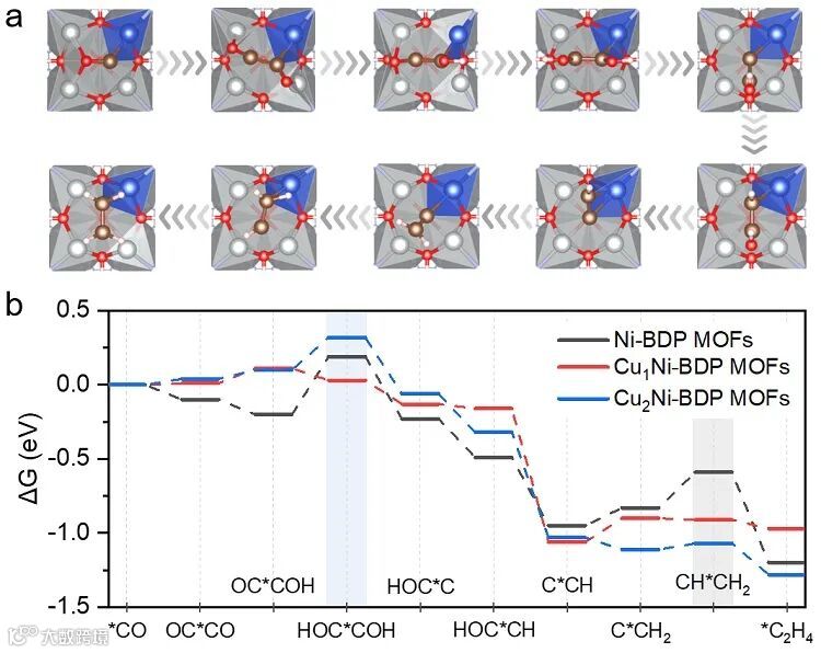 ]立方簇结构共同增强了MOF的稳定性;原位红外光谱和理论计算表明非对称Ni/Cu位点协同降低了*COCOH中间体的反应能垒,更利于乙烯产物路径。相关论文发表于