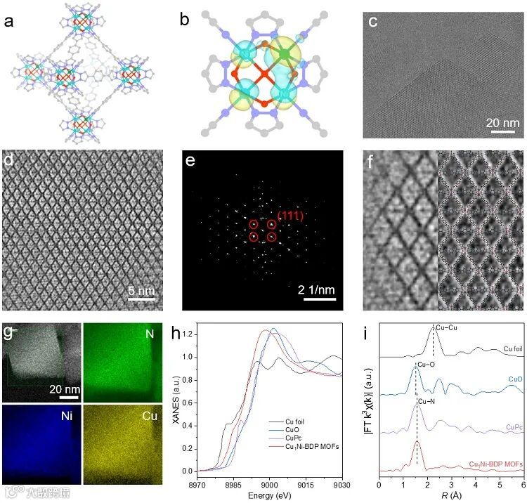 Ni-BDP MOF的原子结构表征。(a) 原子结构模型;(b) 差分电荷密度;(c) TEM图;(d) 衬度传递函数校正(CTF) HRTEM图;(e) 快速傅里叶变换(FFT)图;(f) 平均背景差滤 (ABSF)处理HRTEM图像;(g) 元素mapping图;(h) XANES谱图;(i) EXAFS谱图。