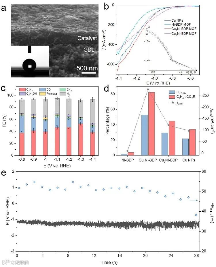 Ni-BDP MOF的结构优势和非对称Ni/Cu簇位点协同作用,该催化剂在流动池反应器中表现出高达52.7%的乙烯法拉第效率,占C