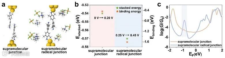 在该工作中,研究者发现超分子自由基结的电导比没有自由基的超分子结高了一个数量级,甚至高于具有相似