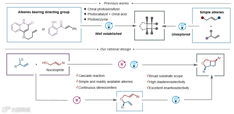 转移形成三线态物种参与的[2+2]环加成反应,由于其具有高的原子经济性以及条件温和等特点,得到了广泛研究。然而可见光促进不对称[2+2]环加成反应非常有挑战性,主要是因为光化学下产生的较高活性自由基中间体,难以同时实现优秀的区域、非对映以及对映选择性控制。为了实现光促进不对称[2+2]环加成反应,目前有以下几种策略:1)手性光敏剂催化;2)手性发色团活化;3)光酶催化(图1)。但仍然存在较多局限:1)底物一般需要预装导向基,无导向、非极性烯烃作为底物的相关报道较少;2)底物一般需要多步合成,尤其对于分子内底物的合成更为复杂;3)同时实现非对映以及对映选择性控制较为困难。因此,发展更直接、高效的方法实现手性环丁烷分子的合成具有重要的研究意义。为了解决这个问题,该研究团队将铱催化不对称烯丙基醚化反应与可见光促进[2+2]环加成反应相结合,利用铱催化不对称烯丙基醚化生成的手性二烯中间体,原位发生高非对映选择性控制的光促进[2+2]环加成反应,从而生成手性环丁烷衍生物。
