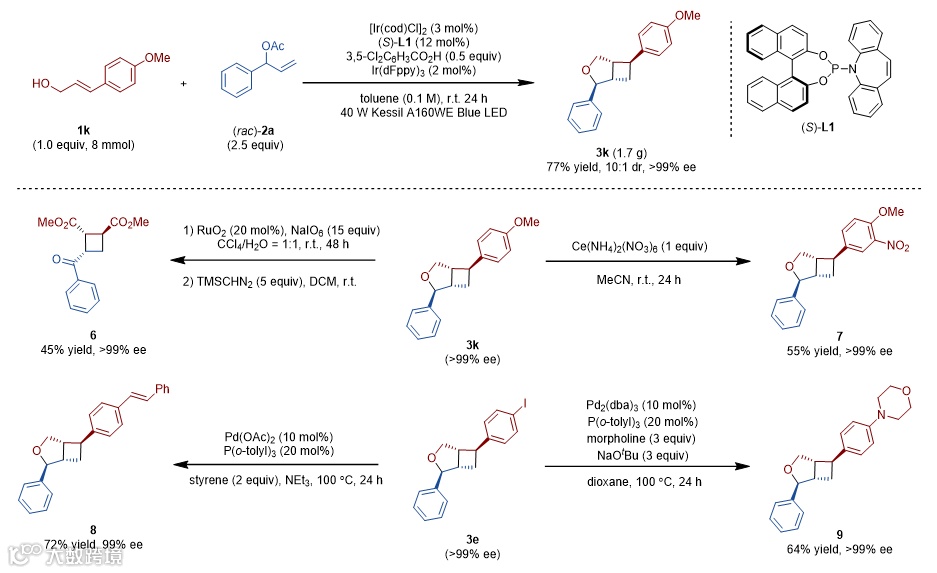 导读:游书力研究员团队报道了铱催化不对称烯丙基醚化与可见光促进[2+2]环加成串联反应,成功实现手性环丁烷衍生物的高效合成。