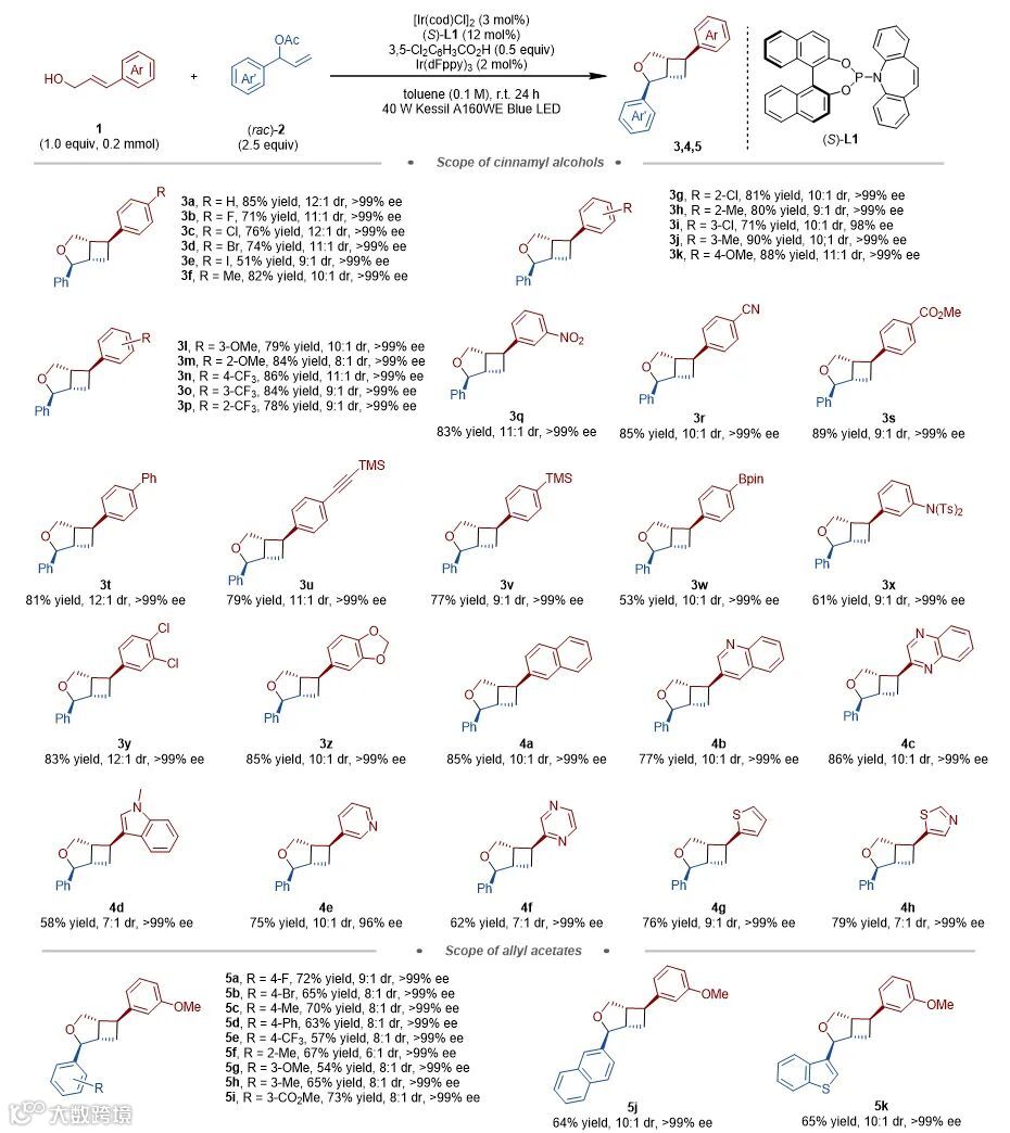 游书力课题组利用铱催化不对称烯丙基醚化与可见光促进[2+2]环加成串联反应,实现了手性环丁烷衍生物的不对称合成。该反应以肉桂醇作为亲核试剂,支链烯丙基醋酸酯作为亲电试剂,在铱/可见光共同作用下,以优秀的收率、非对映以及对映选择性顺利获得手性环丁烷衍生物。与已知的不对称[2+2]光环化反应策略相比,该方法底物简单易得,普适性广,不需要预装导向基,且具有较为优秀的立体选择性控制,为手性环丁烷衍生物的合成提供了简单有效的方法。相关研究结果近期发表在